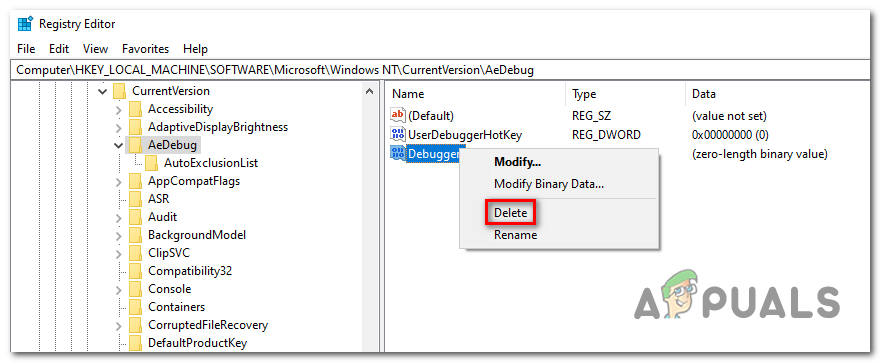 Deleting the Debugger registry value - Next, navigate to one of the following locations depending on your machine:
