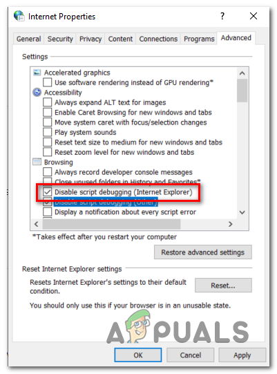 Disabling script debugging - Click Apply to save the changes, then close the Internet Properties window.
