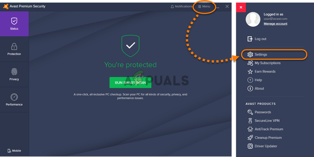 - Click the Menu button at the top-right corner of Avast’s user interface and choose Settings from the context menu which will appear.