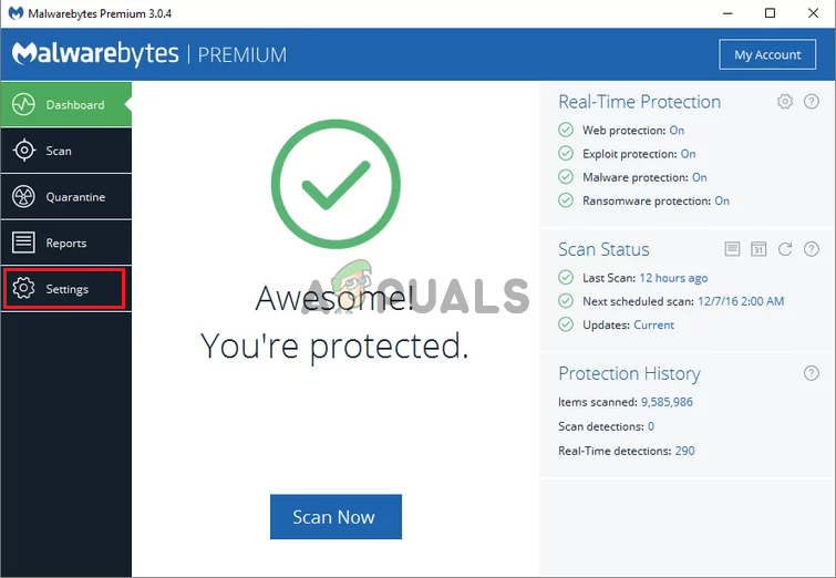 - Open Malwarebytes after the installation by double-clicking the Desktop icon or by searching for it in the Start menu. It may start automatically. Once inside, click Settings from the left-side navigation menu.