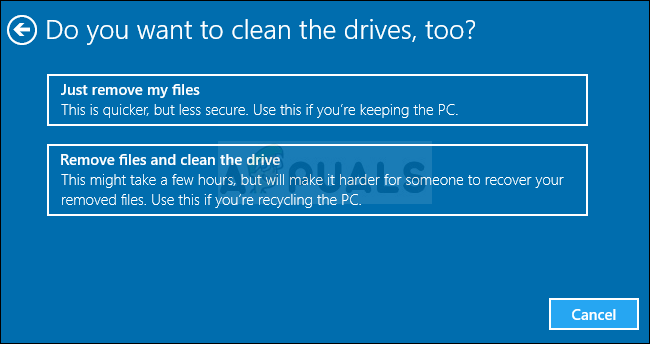 - Select “Just remove my files” or “Remove files and clean the drive” if you chose to “remove everything” in the prior step. Cleaning the drive option takes a lot longer but it will make sure that, if you are giving the computer away or selling it, the next person will have a hard time recovering your erased files. If you are keeping the computer for yourself, choose “Just remove my files.”