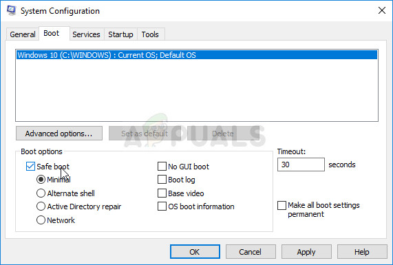 - In the System Configuration window, navigate to the Boot tab to the right and check the box next to the Safe Boot Click OK and restart your computer in order to boot into Safe Mode.