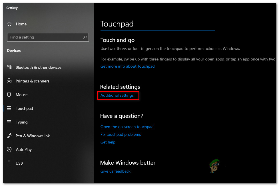 Accessing the Mouse & Touch-pad menu on Windows 10 - From the next menu, make sure to select the TouchPad tab from the vertical menu on the right, then move over to the right pane and click on Additional settings (under Related settings).