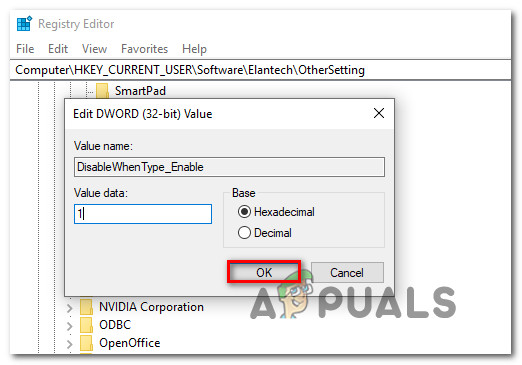 If you’re encountering the issue with an Elantech driver, chances are the issue is being caused by a specific Registry value called DisableWhenType_Enable. Several affected users have reported that they managed to resolve the issue by using Registry Editor to modify this value so that it stays disabled no matter one.