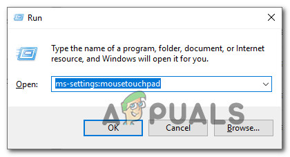 - Press Windows key + R to open up a Run dialog box. Then, type “ms-settings:mousetouchpad” inside the Run box and press Enter to open up the Mouse & Touchpad menu of the Settings app.