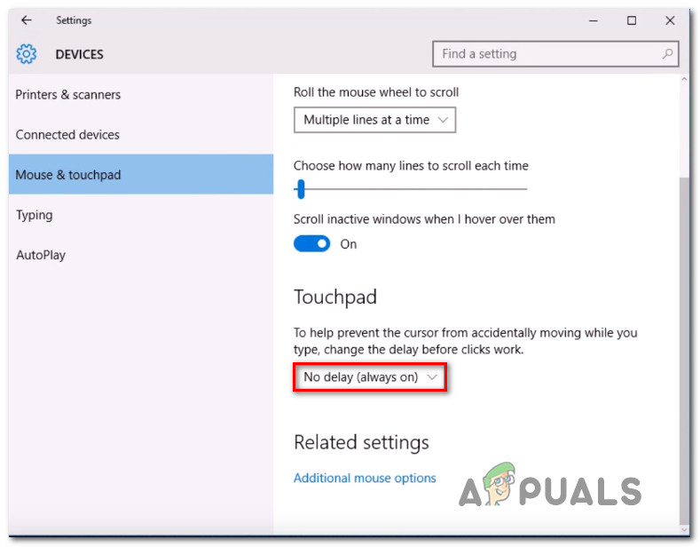 Accessing the Mouse & Touch-pad menu on Windows 10 - From the next screen, move over to the right pane and scroll down to Touchpad. Once you get there, expand the drop-down menu associated with it and set it to No delay (always on).
