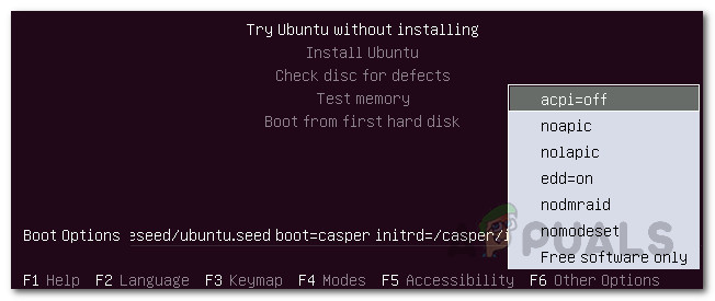 Ubuntu Advanced Welcome Page - Here, press the F6 key to bring up the boot commands.