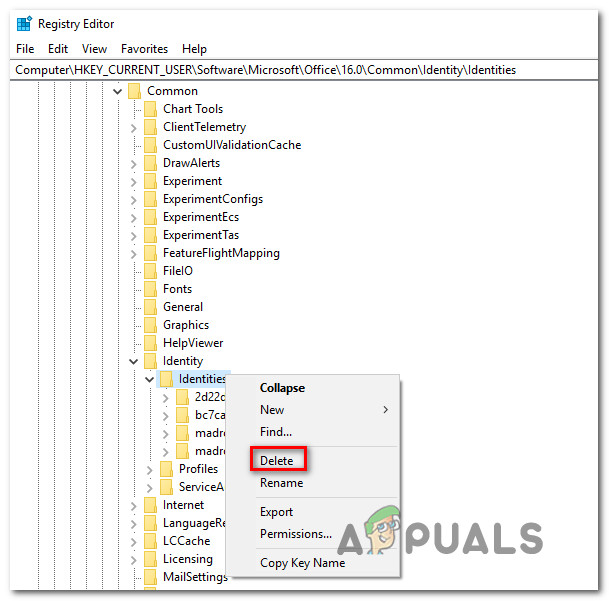 - Once you get to the correct location, right-click on the Identities key from the left-hand menu and choose Delete from the newly appeared context menu.