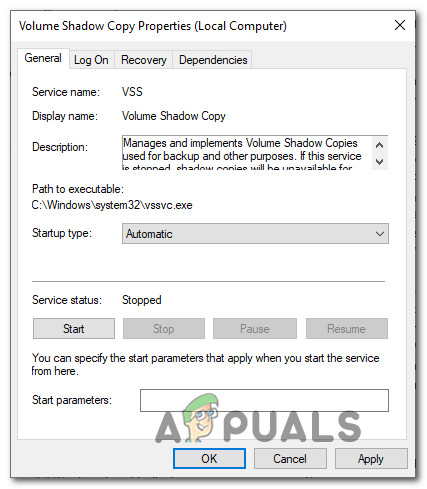 - VSS service is set to Manual – As it turns out, this particular issue can occur in instances where the Startup type of the VSS service is not configured to Automatic. This might prevent certain process by calling the service, and might also leave it opened in instances where it’s not needed. In this case, you will be able to resolve the issue by changing the startup type to Automatic.