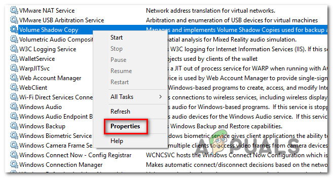 Running Services - Once you’re inside the Services screen, scroll down through the list of Services (Local) and locate Volume Shadow Copy. Once you see it, right-click on it and choose Properties from the newly appeared context menu.