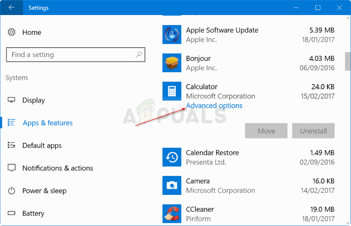 - Click the Apps section in Settings and the list of installed apps should appear under Apps & features. Locate Calculator in the list, left-click its entry on the list, and click the Advanced options button which will appear.