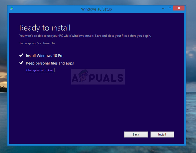 - After that, you should already see the Ready to install screen with Install Windows and Keep personal files and apps options being listed. This has been chosen automatically since you are already running Windows 10 and you want to keep everything.