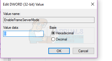 - Double-click on the newly created EnableFrameServerMode registry value to edit it and type 0 into its Value data: