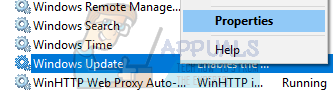 - Once in services, navigate to the near bottom of the screen and locate Windows Update. Right-click it and select Properties.