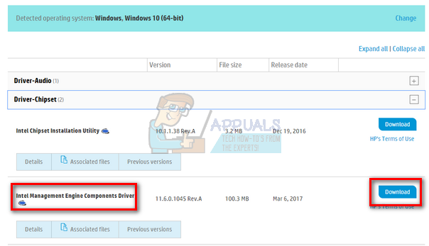 - Once you have selected your machine and are redirected to the drivers’ page, expand the option of “Driver-Chipset” and download “Intel Management Engine Components Driver”.