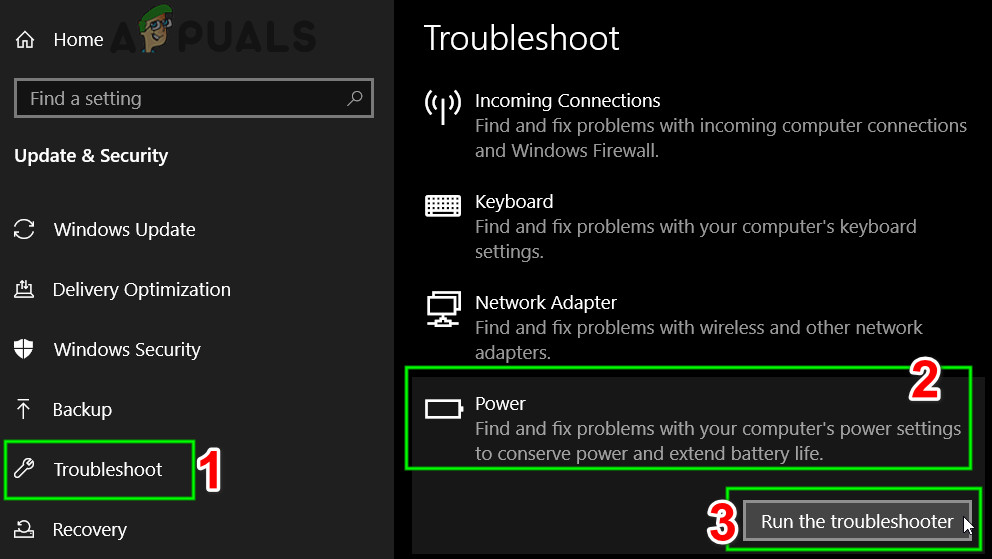 To troubleshoot, Windows has many built-in troubleshooters. As we are having issues with the power settings of the system, we can try running the Power troubleshooter and see if this does the trick for us. When you run the power troubleshooter, it will automatically check the registry, the hardware, and the interacting software components and make sure everything is in place. If any discrepancy is found, it will be restarted/reset automatically and fixed.
