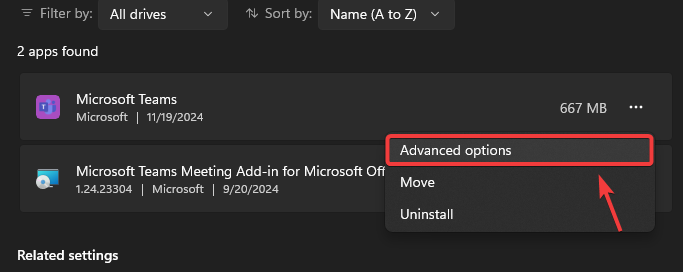 - Find the app you are trying to update, click the three dots next to it, and select Advanced Options.