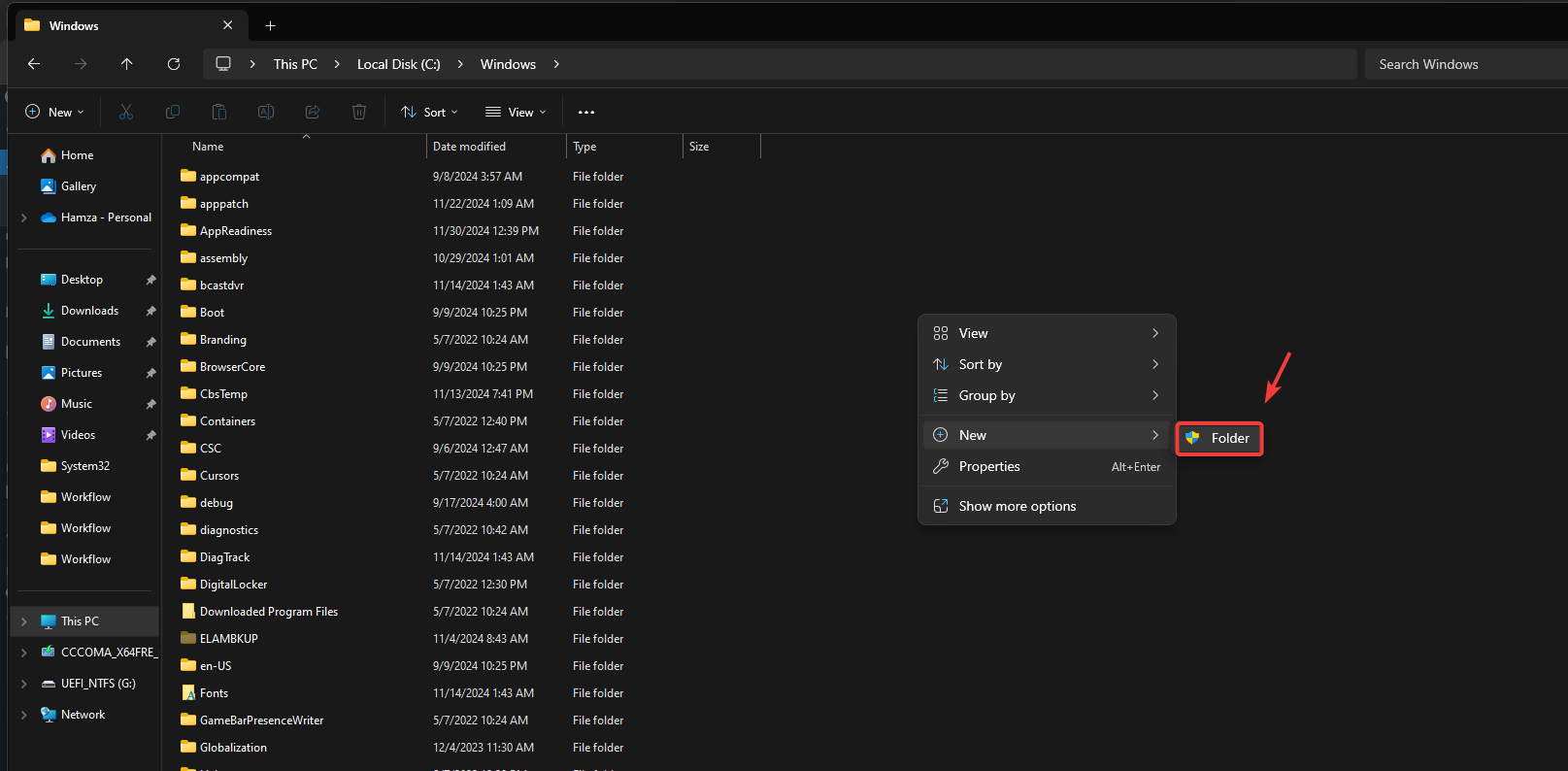 - Right-click on an empty space, hover over New, and select Folder to create a new folder.