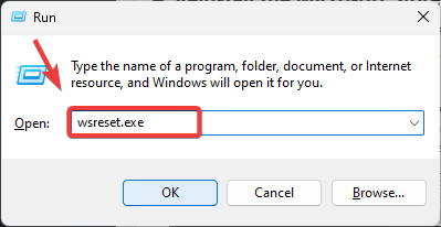 - Type wsreset.exe in the input box and click OK to reset the Microsoft Store cache.