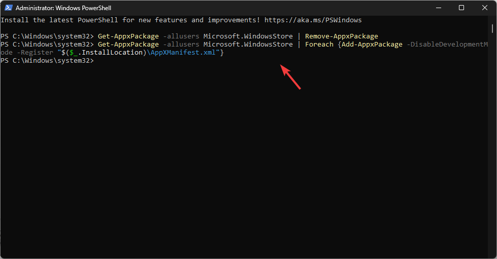 - Enter the following commands one by one, pressing Enter after each, to reinstall the Microsoft Store: