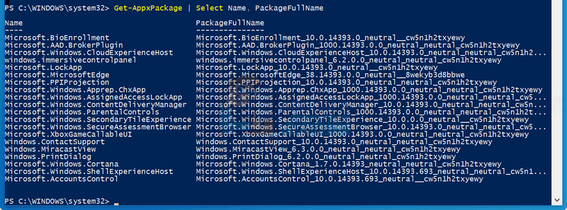 - The output of the above command will be a list with two columns. Under the first column the full name of the App (Name) is displayed and at the second column the Full Package Name (PackageFullName) is displayed.