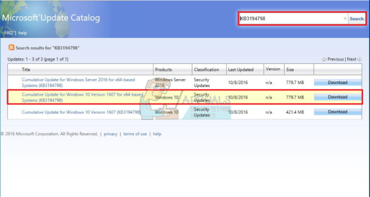 - Open the Microsoft Update Catalog and perform a search by clicking on the search button at the top right corner. Make sure you copy the exact same Knowledge Base number.