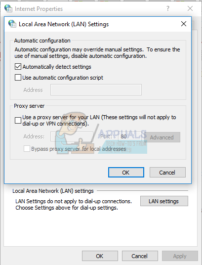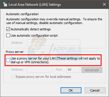 - Uncheck the option Use a proxy server for your LAN (These settings will not apply to dial-up connections or VPN)