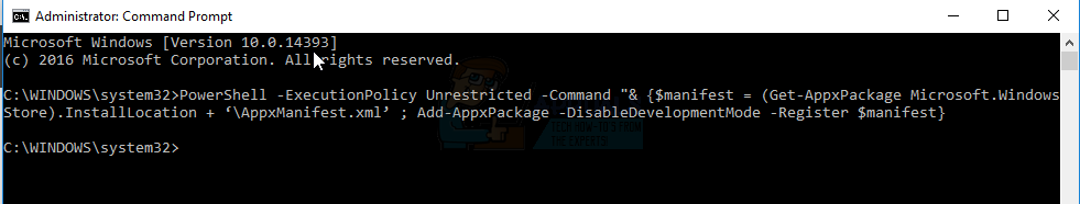 PowerShell -ExecutionPolicy Unrestricted -Command “& {$manifest = (Get-AppxPackage Microsoft.WindowsStore).InstallLocation + ‘\AppxManifest.xml’ ; Add-AppxPackage -DisableDevelopmentMode -Register $manifest}