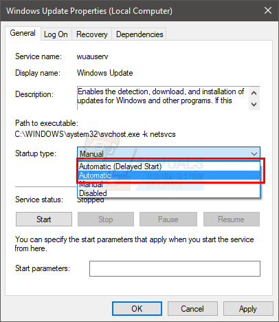 - Make sure the service’s Startup Type is set to automatic. Select Automatic or Automatic (Delayed Start) from the drop down menu in Startup Type