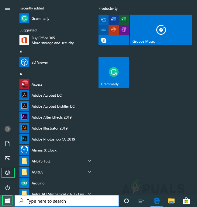 - Click Start > Settings Gear Icon.