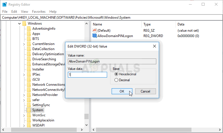 - Click on this key and try to locate an entry named AllowDomainPINLogon. If it’s not there, create a new DWORD Value entry called AllowDomainPINLogon by right-clicking at the right side of the window and choosing New >> DWORD (32-bit) Value. Right-click on it, and choose the Modify option from the context menu.