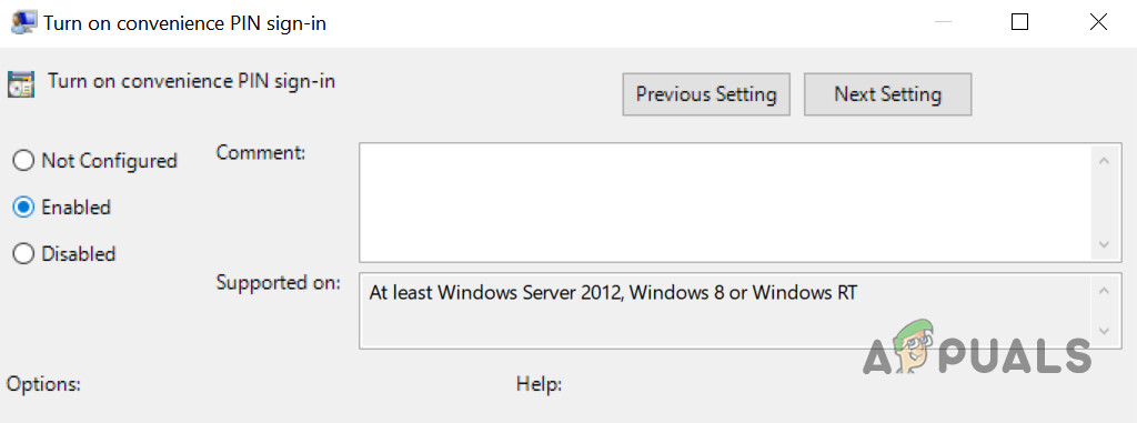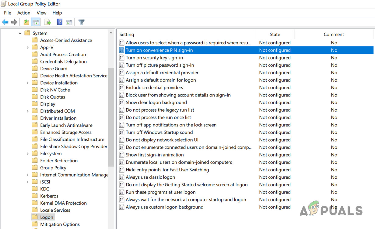 Enable the Turn on Convenience Pin Sign-In Policy - Now click on Apply/OK and then, in the left pane of the Group Policy Editor, navigate to the following: