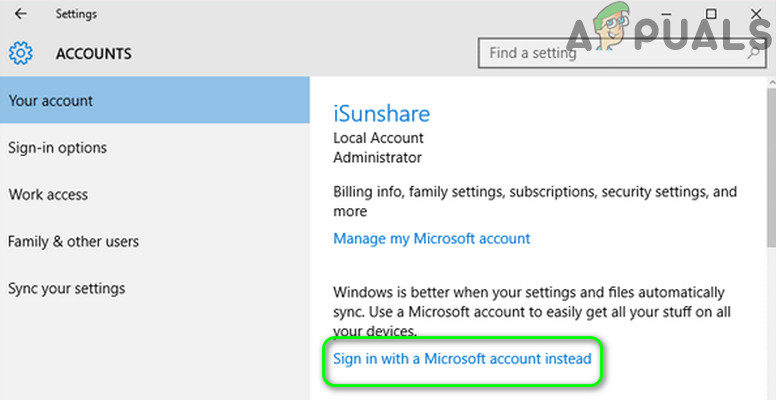 You may encounter the error at hand if your Microsoft account is not properly set up on the problematic device or its profile on the system is corrupt. In this context, switching to a local account and then reverting to the Microsoft account may solve the problem.
