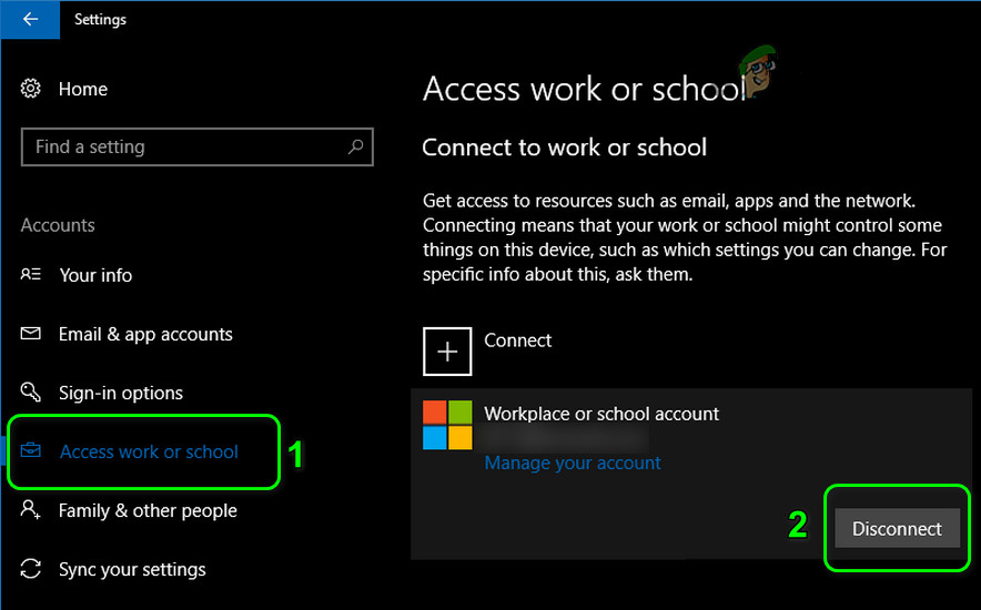 - Now Disconnect from the work/school account (no need to touch “Connected to whatever domain”.