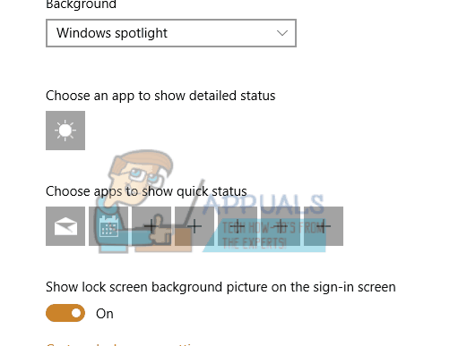 - Once in the lock screen settings, click on the Mail icon present under the heading of “Choose apps to show quick status”. Navigate to the very top in the option and select “None”. Do the same for Calendar. Now uncheck the option which says “Show lock screen background on the sign-in screen”. After making the changes, press Windows + L to check if Spotlight started working again. If it didn’t, restart your computer.