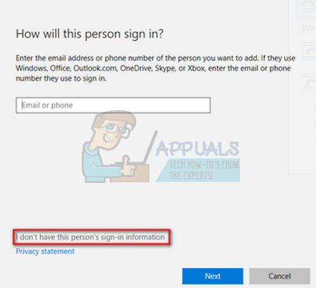 - Now Windows will guide you through its wizard on how to create a new account. When the new window comes forth, click “I don’t have this person’s sign-in information”.