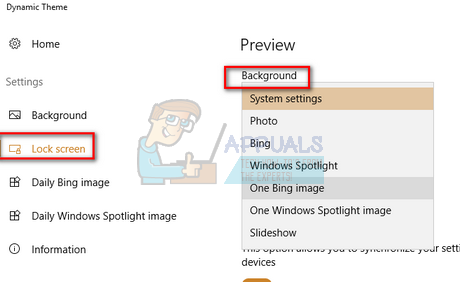 - Click on “Lock screen” from the left navigation pane. Click on the background drop-down select from the list of options. You can choose Bing or Windows Spotlight for images which will rotate similar to the application by windows.