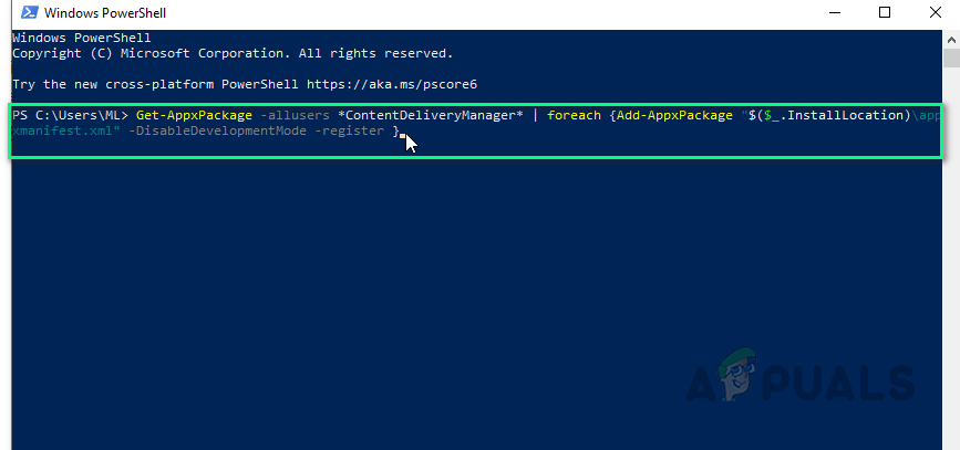 Get-AppxPackage -allusers *ContentDeliveryManager* | foreach {Add-AppxPackage "$($_.InstallLocation)\appxmanifest.xml" -DisableDevelopmentMode -register }