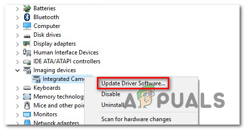 Opening the Device Manager - Inside Device Manager, scroll down through the list of installed devices and expand the drop-down menu associated with Imaging devices. Then, right-click on your webcam and choose Update Driver Software from the newly appeared context menu.