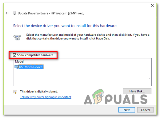 Click on Let me pick from a list of available drivers on my computer - At the next screen, start by checking the box associated with Show compatible hardware, then select the USB Video Device from the list of available drivers. With the correct driver selected, click Next.