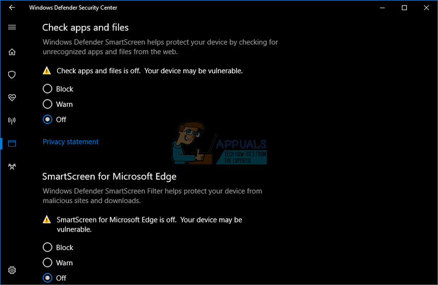 - Also, turn off the SmartScreen for Windows Store apps option below.