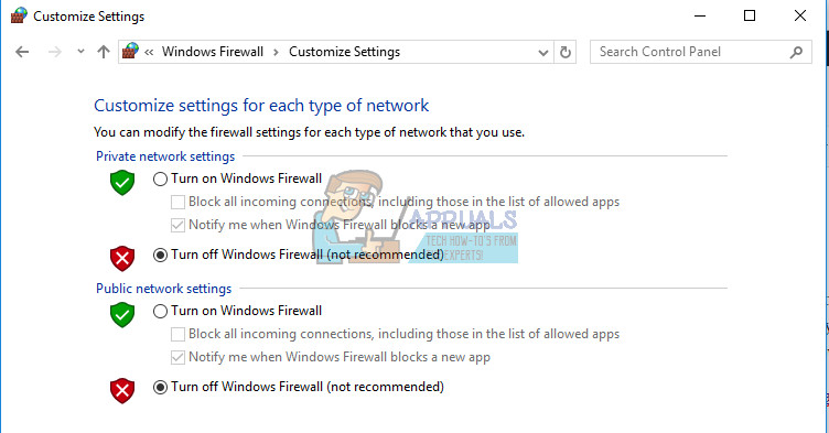 - Click the radio button next to the “Turn off Windows Firewall (not recommended)” option next to both the Private and Public network settings.