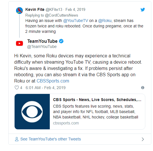 Another scenario that numerous users face is where their host devices (for example, Chromecast, Roku, etc.) fail to stream YouTube TV. If the issue is not at YouTube’s end, it releases an official statement that the Host Device (for example Roku) knows about the outage and is working on a fix.