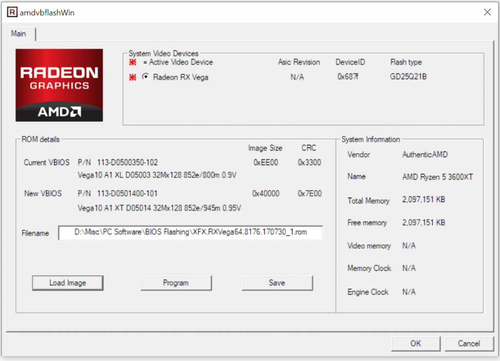 - Select the downloaded target BIOS (in this case the XFX Radeon RX Vega 64 BIOS)
