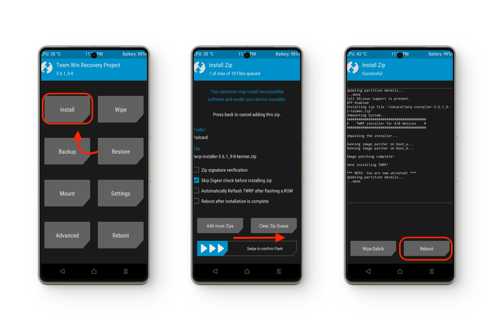 - In TWRP, tap on Install > Swipe to confirm flash > Reboot.