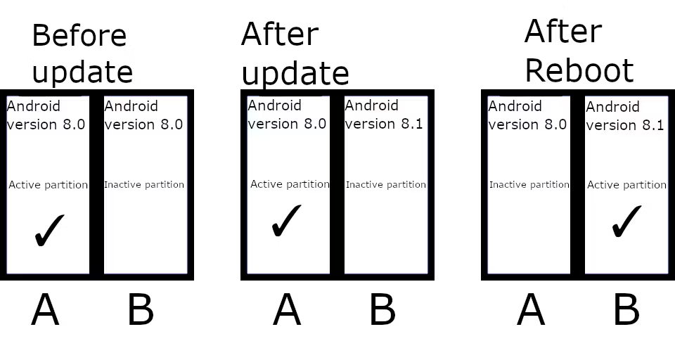 For devices that support A/B partitions or “Seamless Updates,” it works in a way that the operating system resides in one slot while any new update that needs to be installed does so in the other (inactive) slot. Once the update is successfully installed, the phone boots into the other partition and designates it as the active partition. However, if the update fails, the phone never boots into the other slot altogether.
