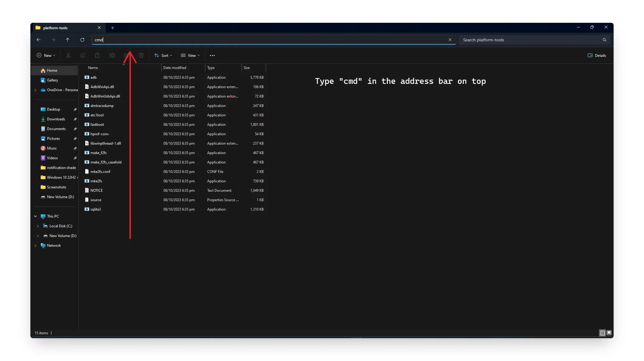 Extracting the Platform Tools’ .zip file - You’ll find a folder named “platform-tools.” Within that folder, tap on the address bar, and type in ‘cmd.’ This will open up Command Prompt.
