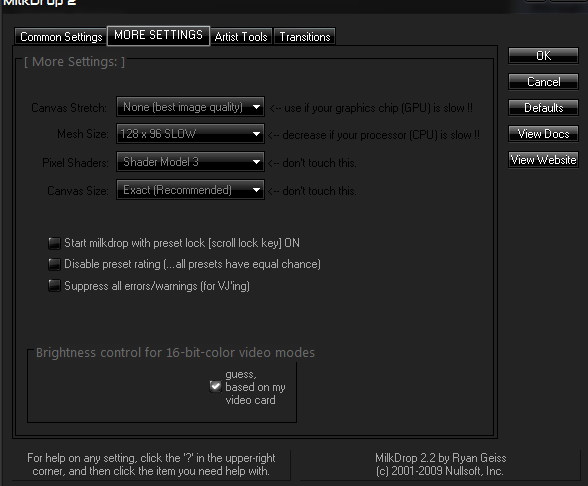 - Canvas Stretch – This option lets you trade resolution [crispness] for speed. If MilkDrop runs too slow, in any mode (windowed/fullscreen/desktop), try cranking up the canvas stretch to, say, 1.5X or 2X. The image will not look as crisp, but MilkDrop will probably run much faster. (Assuming that your graphics chip was the bottleneck.)