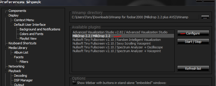 In Foobar, go to File > Preferences > Visualisations > Shpeck, and in the top bar for “Winamp directory”, click the “…” button and point it to the Winamp.exe we downloaded in the previous step.