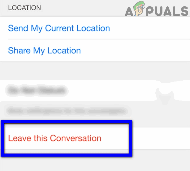 - Locate the Leave this Conversation button (with the words on it in red font, located under the Hide Alerts option) and tap on it.